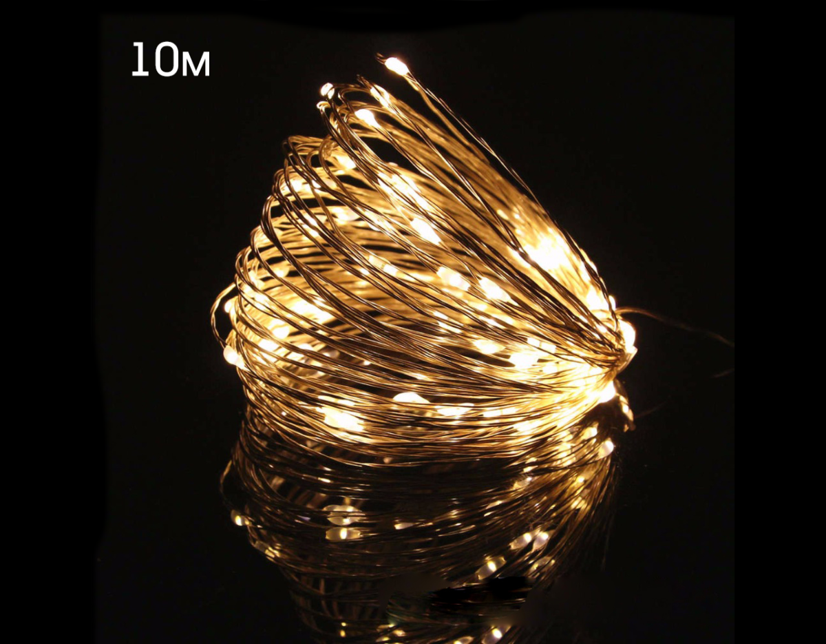 - Гирлянда светодиодная Огонек OG-LDG14 проволочная, LED Белая Теплая, 10 метров, питание 3*АА