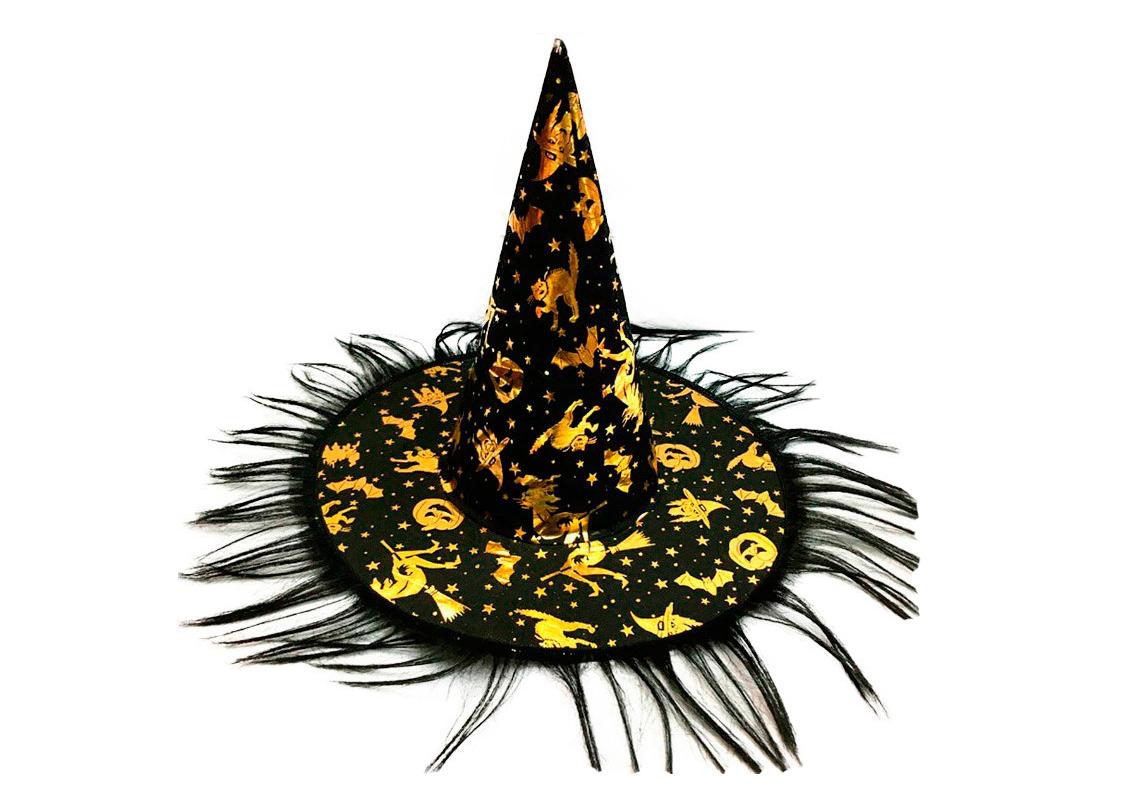 - Колпак Ведьмы с нечистой силой, с бахромой, черный полиэстер с рисунком, размер 52-54