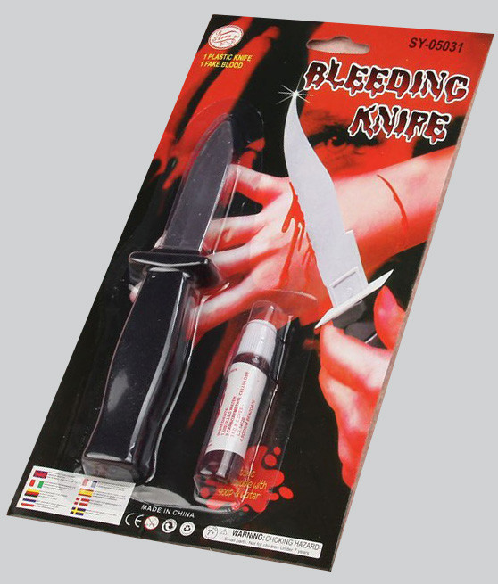 - Нож убирающийся с кровью, черный пластик, жидкая кровь, длина 15 см