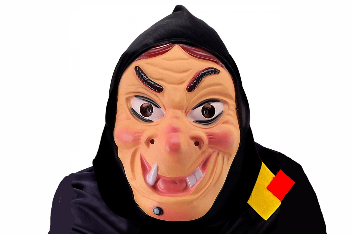 - Маска Ведьма в черном платке шатенка, бежевый пластик, черная ткань, без размера