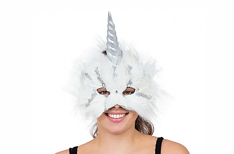 - Маска Единорог лохматый EM807, белая полумаска, (Перья, пластмасса, тесьма), без размера
