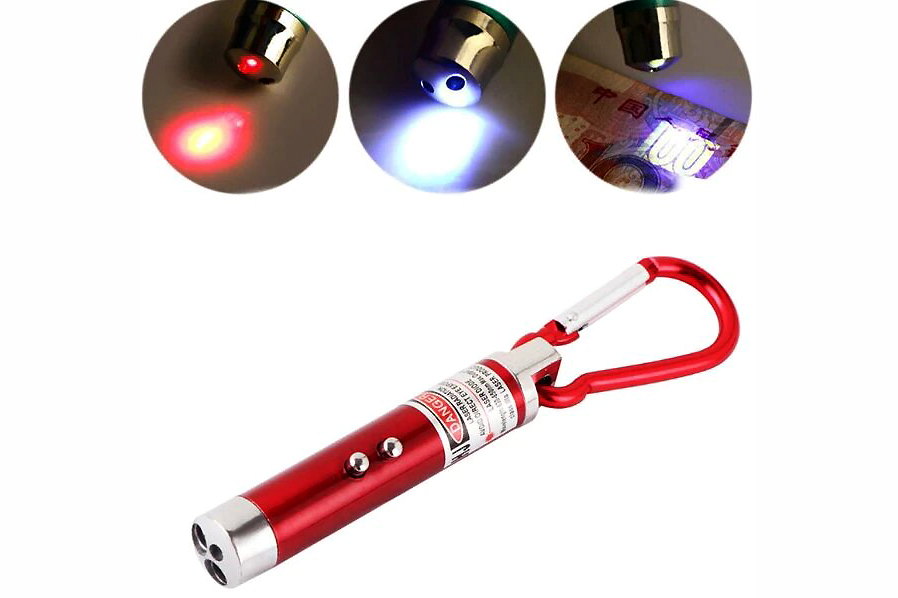 - Лазер-брелок фонарик + УФ 3в1 Ø 1,2*7 см с карабином 12 шт/уп
